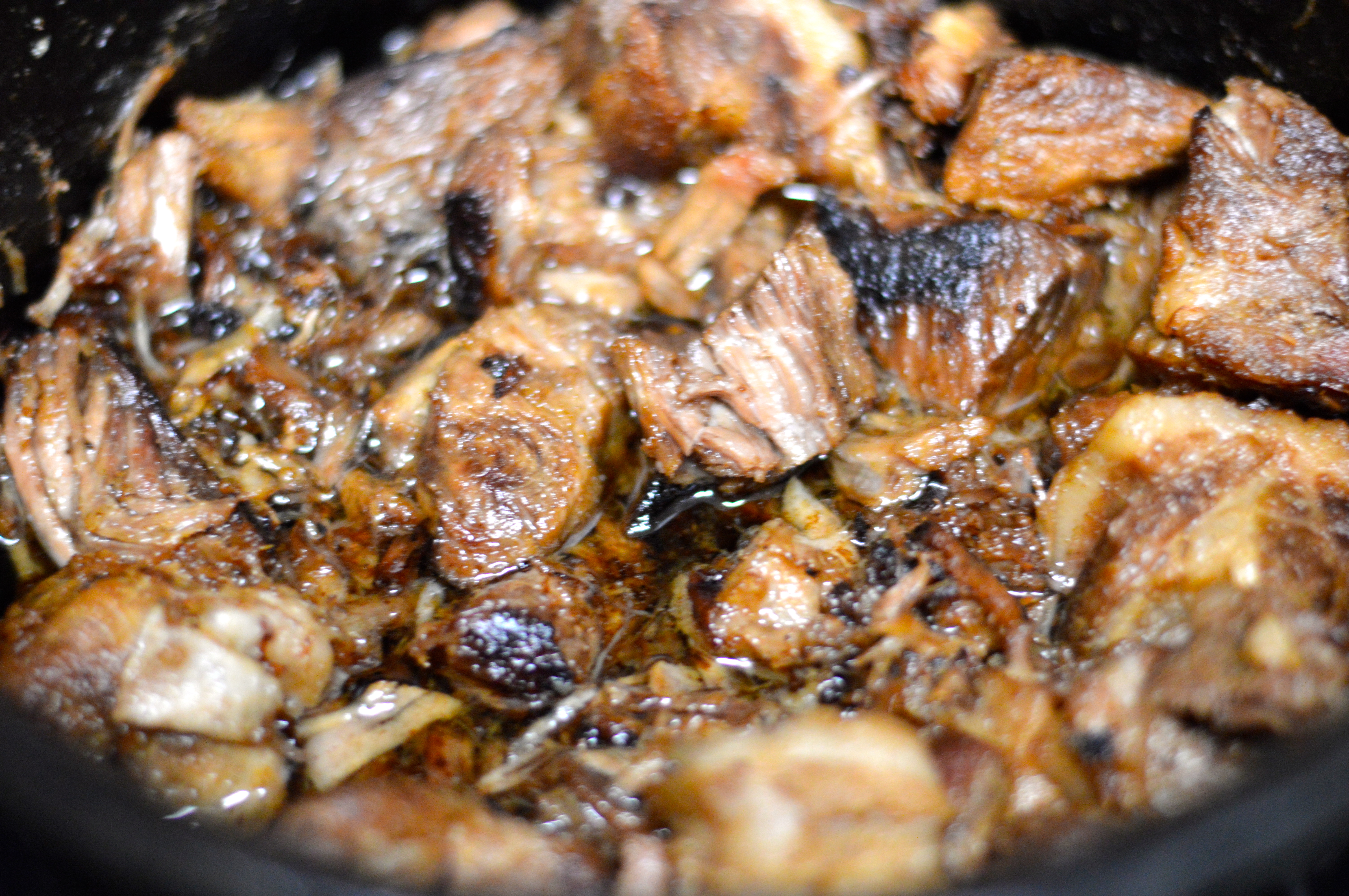 - After 2 hours, the pork should be tender. Turn the heat back up to medium high and bring the pot back to a rolling boil. Stir the pot periodically, and after about 45 minutes, the liquid should have boiled off and there should be plenty of clear fat bubbling around the pork.